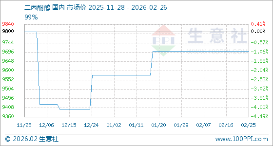 2月26日,生意社二丙酮醇基准价为9700.00元/吨,与本月初持平。