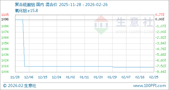 2月26日,生意社聚合硫酸铝基准价为1012.50元/吨,与本月初持平。