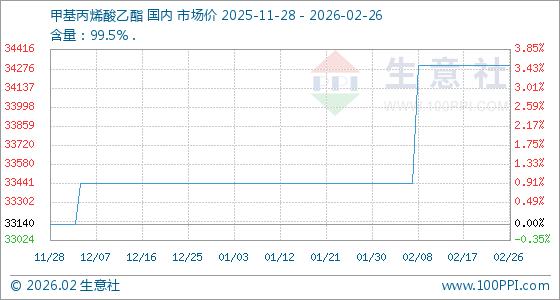 2月26日,生意社甲基丙烯酸乙酯基准价为34300.00元/吨,与本月初(33440.00元/吨)相比,上涨了2.57%。