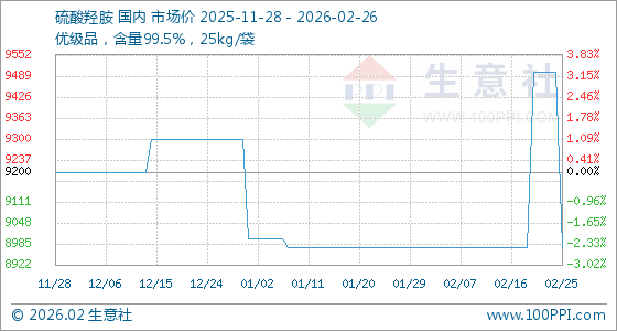 2月26日,生意社硫酸羟胺基准价为8975.00元/吨,与本月初持平。