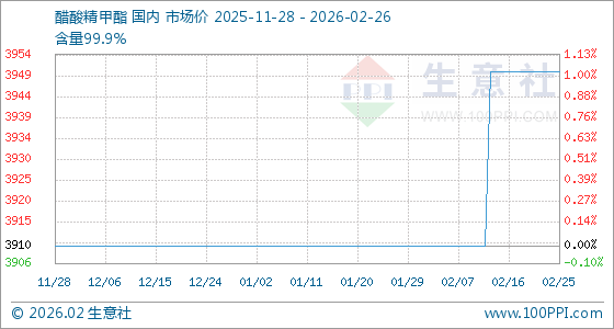 2月26日,生意社醋酸精甲酯基准价为3950.00元/吨,与本月初(3910.00元/吨)相比,上涨了1.02%。