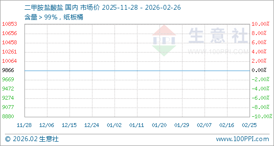 2月26日,生意社二甲胺盐酸盐基准价为9866.67元/吨,与本月初持平。