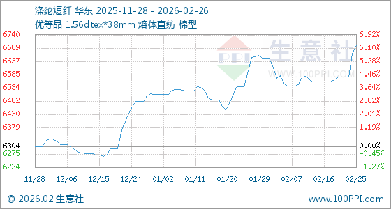 2月26日,生意社涤纶短纤基准价为6697.79元/吨,与本月初(6649.67元/吨)相比,上涨了0.72%。