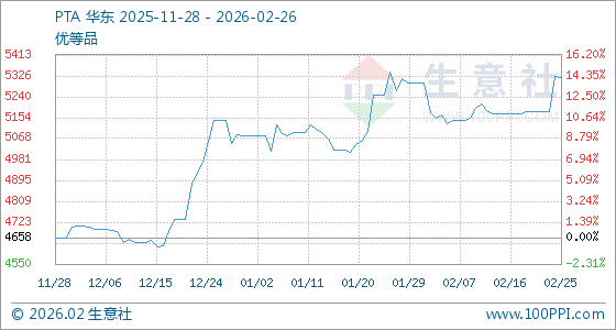 2月26日,生意社PTA基准价为5319.43元/吨,与本月初(5298.83元/吨)相比,上涨了0.39%。