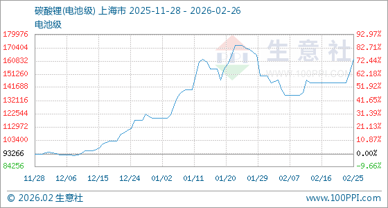 2月26日,生意社碳酸锂(电池级)基准价为162000.00元/吨,与本月初(150000.00元/吨)相比,上涨了8.00%。