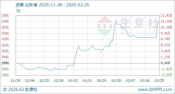 2月26日,生意社沥青基准价为3323.33元/吨,与本月初(3320.00元/吨)相比,上涨了0.10%。