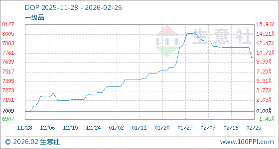2月26日,生意社DOP基准价为7700.84元/吨,与本月初(8017.50元/吨)相比,下降了3.95%。