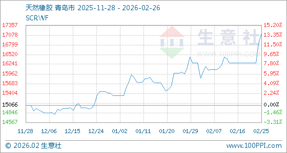 2月26日,生意社天然橡胶基准价为17125.00元/吨,与本月初(16275.00元/吨)相比,上涨了5.22%。