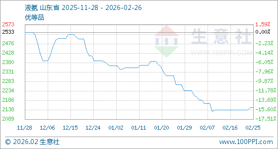 2月26日,生意社液氨基准价为2150.00元/吨,与本月初(2236.67元/吨)相比,下降了3.87%。