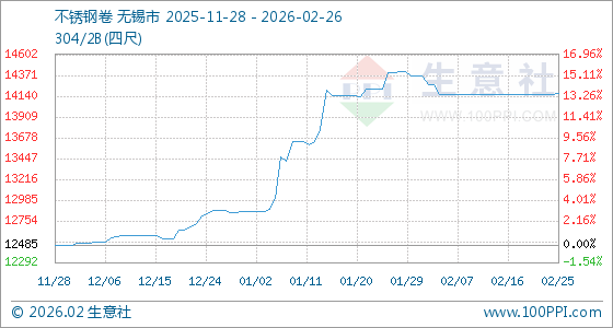 2月26日,生意社不锈钢卷基准价为14175.00元/吨,与本月初(14360.00元/吨)相比,下降了1.29%。