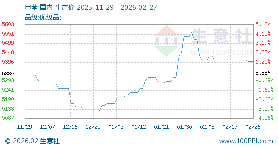 2月27日,生意社甲苯基准价为5400.00元/吨,与本月初(5540.00元/吨)相比,下降了2.53%。