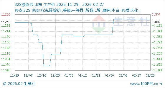 2月27日,生意社32S涤纶纱基准价为11266.67元/吨,与本月初(11200.00元/吨)相比,上涨了0.60%。