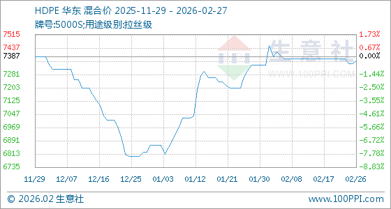 2月27日,生意社HDPE基准价为7362.50元/吨,与本月初(7337.50元/吨)相比,上涨了0.34%。