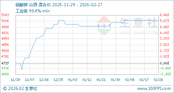 2月27日,生意社硝酸钾基准价为5012.50元/吨,与本月初(5000.00元/吨)相比,上涨了0.25%。