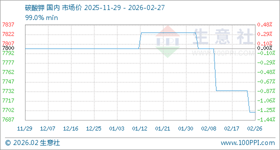 2月27日,生意社碳酸钾基准价为7700.00元/吨,与本月初(7825.00元/吨)相比,下降了1.6%。