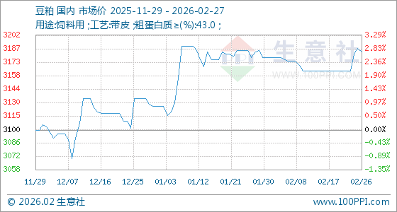 2月27日,生意社豆粕基准价为3184.00元/吨,与本月初(3178.00元/吨)相比,上涨了0.19%。