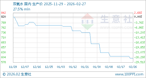 2月27日,生意社双氧水基准价为600.00元/吨,与本月初(676.67元/吨)相比,下降了11.33%。