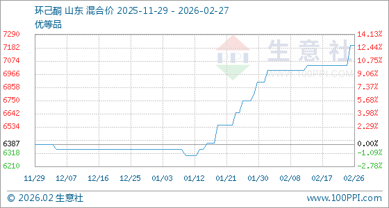 2月27日,生意社环己酮基准价为7200.00元/吨,与本月初(6900.00元/吨)相比,上涨了4.35%。