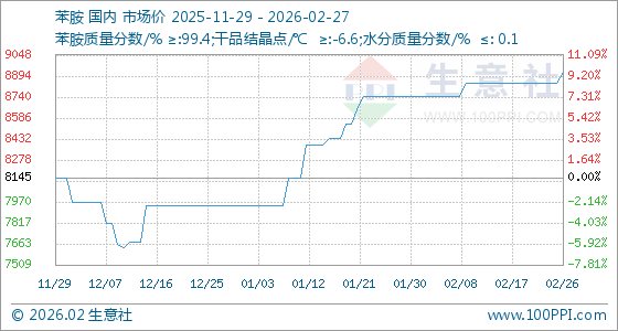 2月27日,生意社苯胺基准价为8920.00元/吨,与本月初(8745.00元/吨)相比,上涨了2.00%。