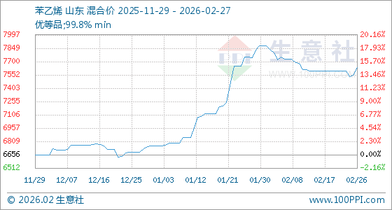 2月27日,生意社苯乙烯基准价为7636.00元/吨,与本月初(7874.00元/吨)相比,下降了3.02%。