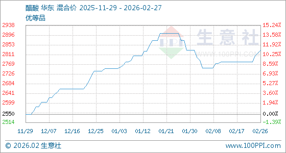 2月27日,生意社醋酸基准价为2830.00元/吨,与本月初持平。