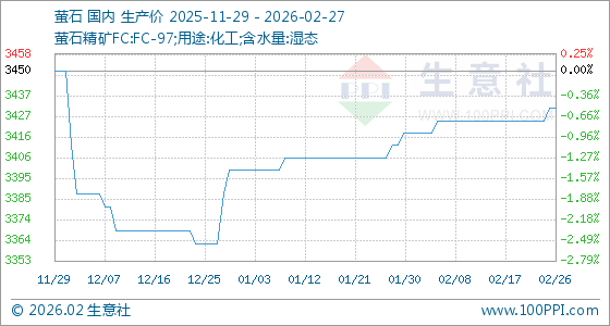2月27日,生意社萤石基准价为3431.25元/吨,与本月初(3418.75元/吨)相比,上涨了0.37%。
