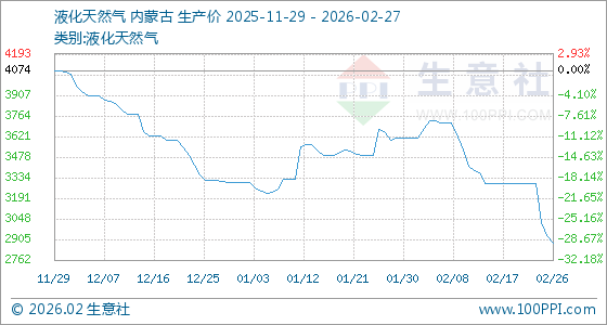 2月27日,生意社液化天然气基准价为2882.00元/吨,与本月初(3610.00元/吨)相比,下降了20.17%。