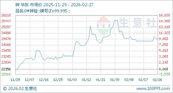 2月27日,生意社锌基准价为24450.00元/吨,与本月初(25776.00元/吨)相比,下降了5.14%。