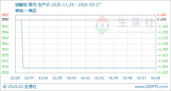 2月27日,生意社硝酸铵基准价为3530.00元/吨,与本月初持平。