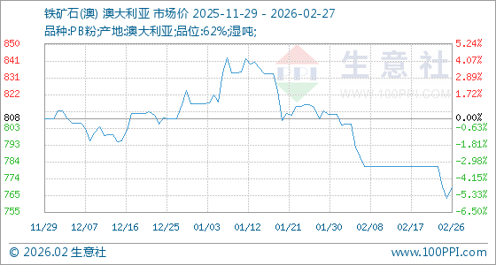 2月27日,生意社铁矿石(澳)基准价为769.56元/吨,与本月初(811.00元/吨)相比,下降了5.11%。