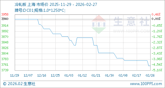 2月27日,生意社冷轧板基准价为3757.50元/吨,与本月初(3807.50元/吨)相比,下降了1.31%。
