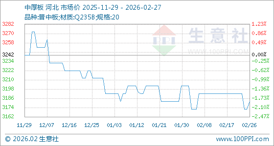 2月27日,生意社中厚板基准价为3182.00元/吨,与本月初(3202.00元/吨)相比,下降了0.62%。