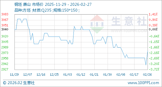 2月27日,生意社钢坯基准价为2980.00元/吨,与本月初(3020.00元/吨)相比,下降了1.32%。
