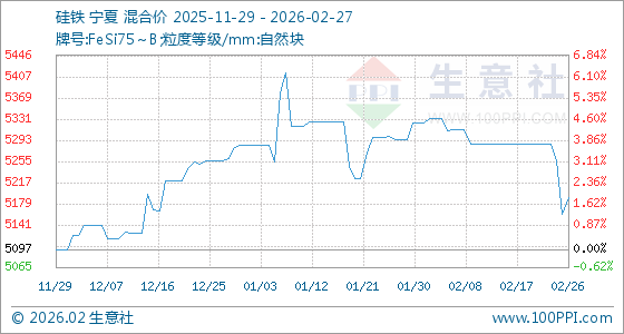 2月27日,生意社硅铁基准价为5190.00元/吨,与本月初(5324.29元/吨)相比,下降了2.52%。