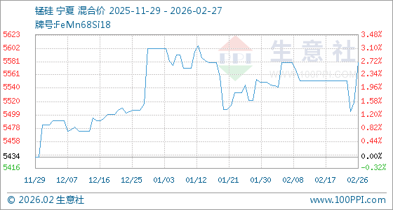 2月27日,生意社锰硅基准价为5580.00元/吨,与本月初(5550.00元/吨)相比,上涨了0.54%。