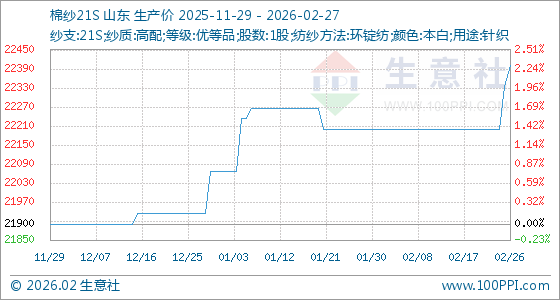 2月27日,生意社棉纱21S基准价为22400.00元/吨,与本月初(22200.00元/吨)相比,上涨了0.90%。