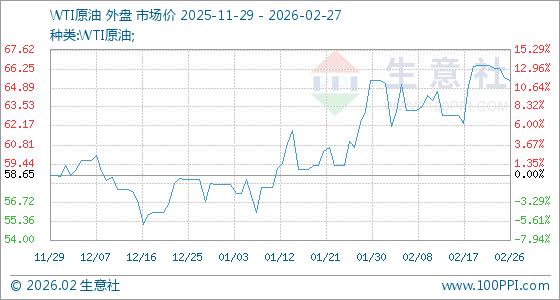 2月27日,生意社WTI原油基准价为65.42美元/桶,与本月初持平。