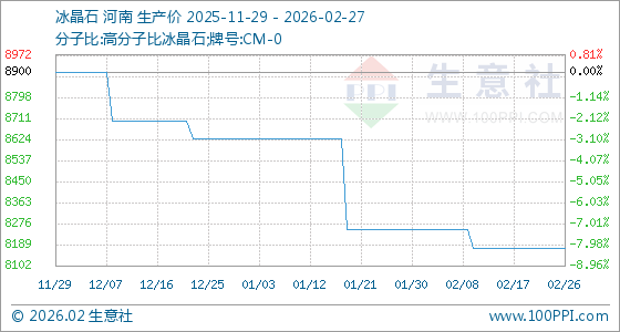 2月27日,生意社冰晶石基准价为8175.00元/吨,与本月初(8250.00元/吨)相比,下降了0.91%。
