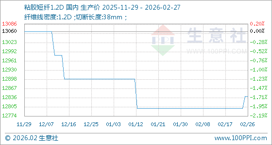 2月27日,生意社粘胶短纤1.2D基准价为12840.00元/吨,与本月初(12800.00元/吨)相比,上涨了0.31%。