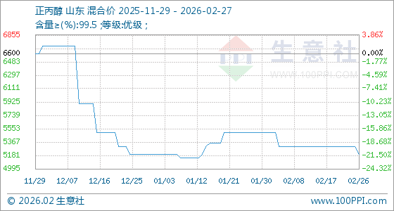 2月27日,生意社正丙醇基准价为5200.00元/吨,与本月初(5500.00元/吨)相比,下降了5.45%。