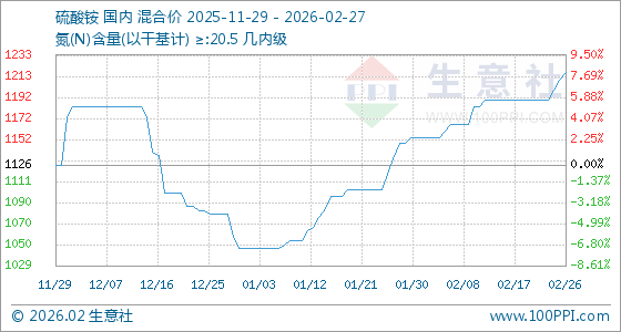 2月27日,生意社硫酸铵基准价为1216.67元/吨,与本月初(1153.33元/吨)相比,上涨了5.49%。