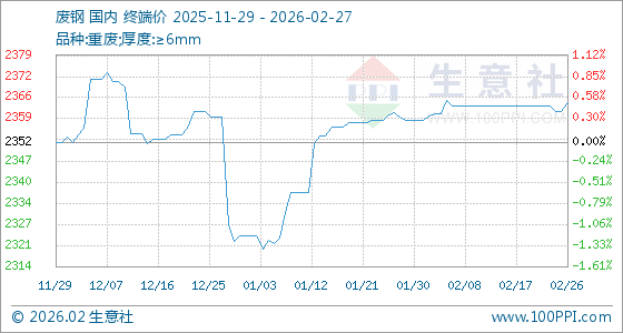 2月27日,生意社废钢基准价为2364.75元/吨,与本月初(2359.58元/吨)相比,上涨了0.22%。