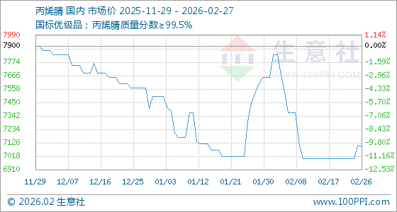 2月27日,生意社丙烯腈基准价为7100.00元/吨,与本月初(7650.00元/吨)相比,下降了7.19%。