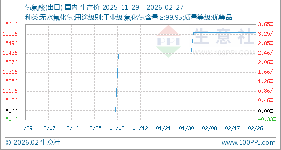 2月27日,生意社氢氟酸(出口)基准价为15566.67元/吨,与本月初(15433.33元/吨)相比,上涨了0.86%。