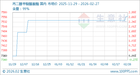 2月27日,生意社丙二醇甲醚醋酸酯基准价为7560.00元/吨,与本月初(7540.00元/吨)相比,上涨了0.27%。