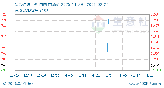 2月27日,生意社复合碳源-1型基准价为725.00元/吨,与本月初持平。