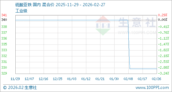2月27日,生意社硫酸亚铁基准价为330.00元/吨,与本月初(340.00元/吨)相比,下降了2.94%。