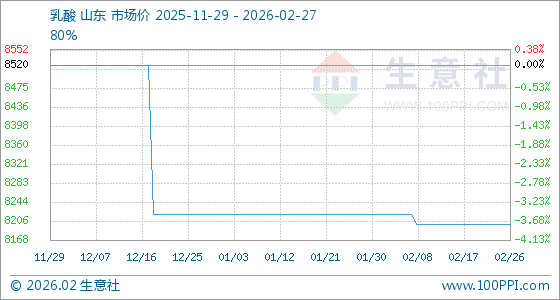 2月27日,生意社乳酸基准价为8200.00元/吨,与本月初(8220.00元/吨)相比,下降了0.24%。