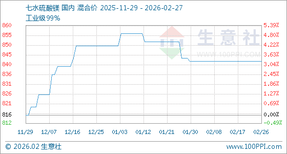 2月27日,生意社七水硫酸镁基准价为842.50元/吨,与本月初持平。