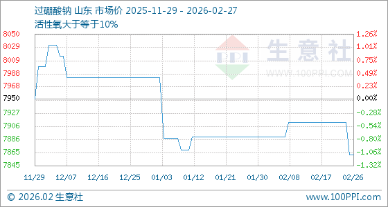 2月27日,生意社过硼酸钠基准价为7862.50元/吨,与本月初(7890.00元/吨)相比,下降了0.35%。